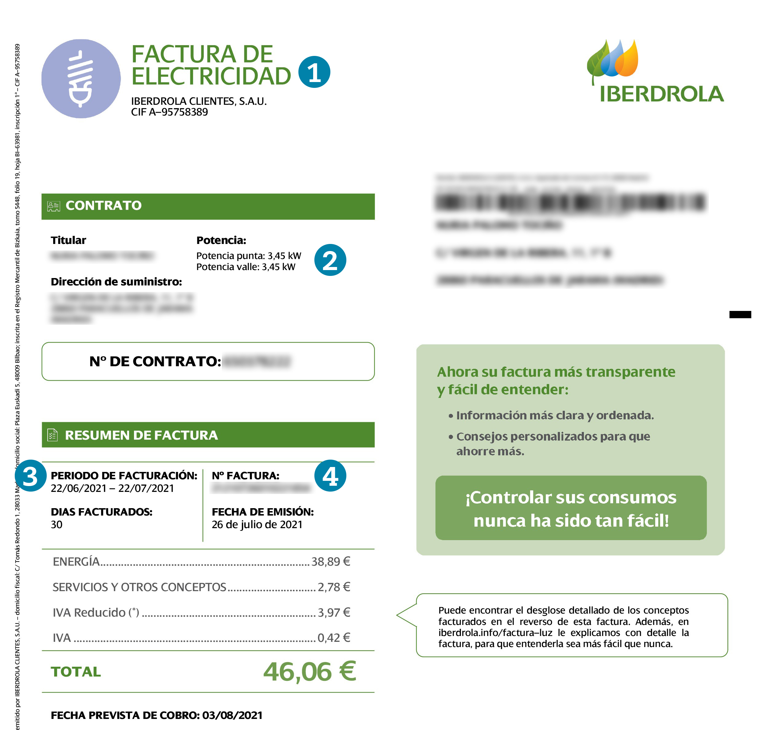 Desglose de la factura. La factura se divide en varios apartados para un mejor entendimiento de los conceptos.
